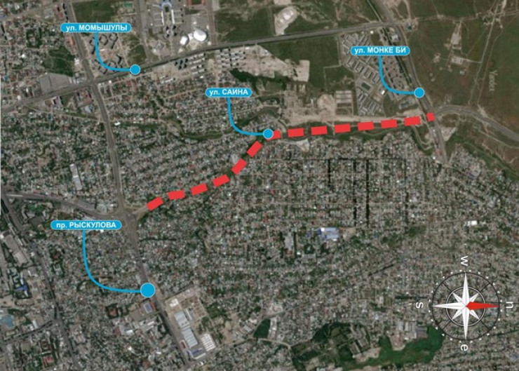 Позже стало известно, что улица Саина будет длиннее. Ее будут пробивать на три километра от проспекта Рыскулова до улицы Монке би. Далее она должна соединиться с магистралью, которая ведет в сторону Бурундайской трассы.