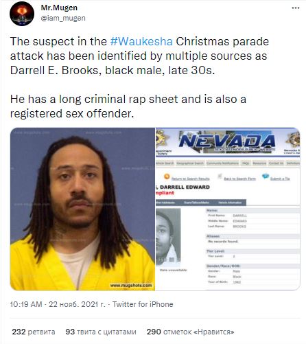 Власти не обнародовали имен ни одного подозреваемого, однако в Сети распространились фото предполагаемого водителя внедорожника, который был идентифицирован несколькими источниками как Даррелл Э. Брукс, темнокожий мужчина около 30 лет. Сообщается, что он был освобожден из тюрьмы округа Милуоки под залог в 1000 долларов два дня назад. Однако точная предполагаемая связь Брукса с инцидентом на параде еще неизвестна.