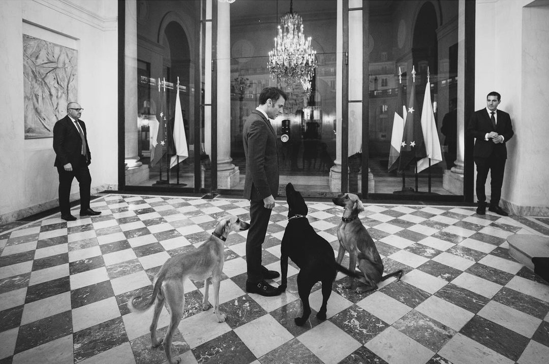 На черно-белом фото запечатлены Эмманюэль Макрон и три собаки – в том числе две тазы по кличке Жюль и Жанна, а также черный лабрадор Немо.