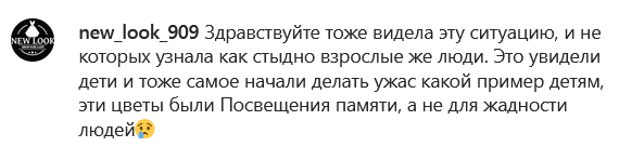 "Сегодня наблюдали такую ситуацию, к памятнику вознесли цветы, там, где раньше был Вечный огонь, не успели отойти, как люди, гуляющие там, стали эти цветы разбирать с такой жадностью, как будто цветов никогда не видел… Позорище", — говорится в подписи к видео.