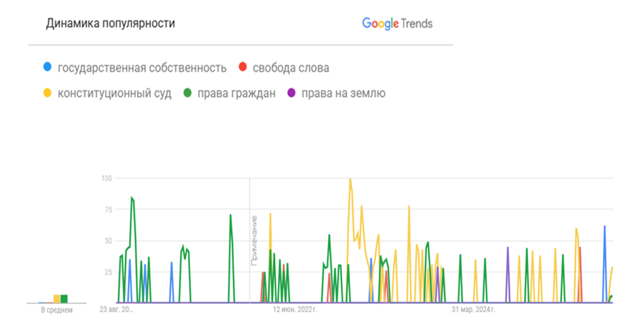 Для более чёткой картины журналист проверила запросы за последние пять лет по ключевым словам: «права граждан», «Конституционный суд», «свобода слова», «право на землю», «государственная собственность». Результаты оказались весьма интересными.
