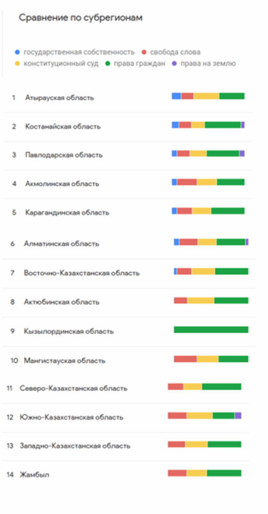 По данным Google Trends, активнее всего запросы по теме конституционных прав и обязанностей делают пользователи из крупных городов — Астаны и Алматы. Там чаще интересуются свободой слова и деятельностью Конституционного суда. В регионах больше беспокоят вопросы о земле и государственной собственности. Сельские жители и жители областных центров чаще задают вопросы: «можно ли приватизировать участок», «как оформить аренду земли» или «что делать, если изымают».