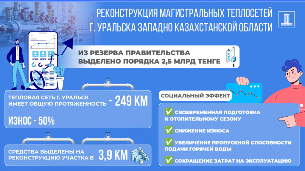 Из резервного фонда Правительства выделено около 2,5 млрд тенге на завершение реконструкции 3,9 км магистральных тепловых сетей в Уральске (ЗКО). Соответствующее постановление подписал Премьер-министр Олжас Бектенов, пишет Caravan.kz со ссылкой на сайт Правительства РК.