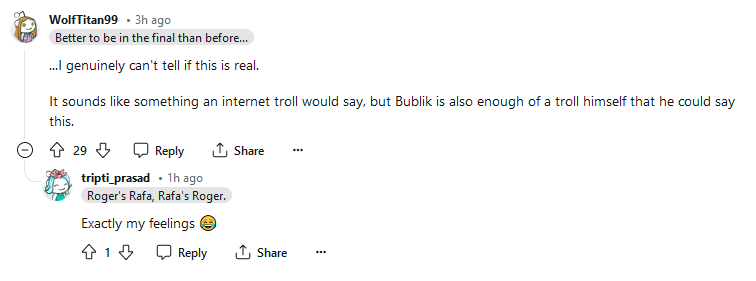 После победы спортсмен принял участие в пресс-конференции. На одном форуме, посвященном теннису, появились любопытные цитаты, которые Бублик якобы сказал на пресс-конференции. В других источниках они не приведены.