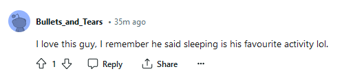 — Люблю его. Помню, как он сказал, что его любимое занятие — это сон.