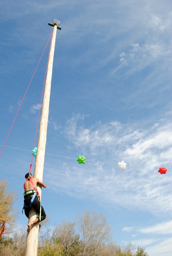 Очередной смельчак пытается достать призового петуха с вершины столба