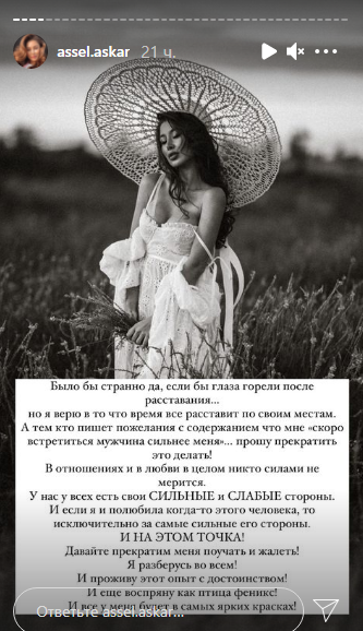 На это Аскар ответила: "Было бы странно, да, если бы глаза горели после расставания… Но я верю в то, что время всё расставит по своим местам. А тем, кто пишет пожелания с содержанием, что мне "скоро встретится мужчина сильнее меня"… прошу прекратить это делать! В отношениях и в любви в целом никто силами не мерится. У нас у всех есть свои сильные и слабые стороны. И если я полюбила когда-то этого человека, то исключительно за самые сильные его стороны. И на этом точка! Давайте прекратим меня поучать и жалеть! Я разберусь во всем! И проживу этот опыт с достоинством! И ещё воспряну, как птица феникс! И всё у меня будет в самых ярких красках!"