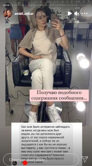 Асель Аскар призналась, что ей часто приходят сообщения, в которых её жалеют и говорят, что от неё больше не исходит такая энергия, как когда они с мужем были вместе.