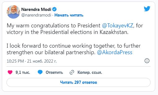 Премьер-министр Индии Нарендра Моди поздравил Касым-Жомарта Токаева с победой на выборах президента Казахстана.