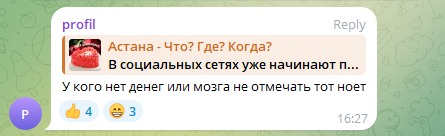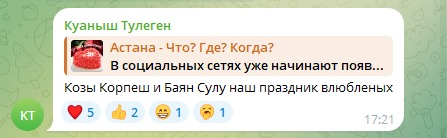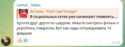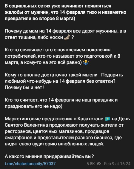 Однако не всем казахстанцам по нраву именно этот день. Связано это с "зарубежными" корнями праздника, а также с тратами на подарки. Комментаторы недоумевают, почему женщинам дарят дорогие подарки, походы в рестораны, а мужчинам – носки с бритвой. Реакции казахстанцев на этот праздник можно посмотреть ниже: