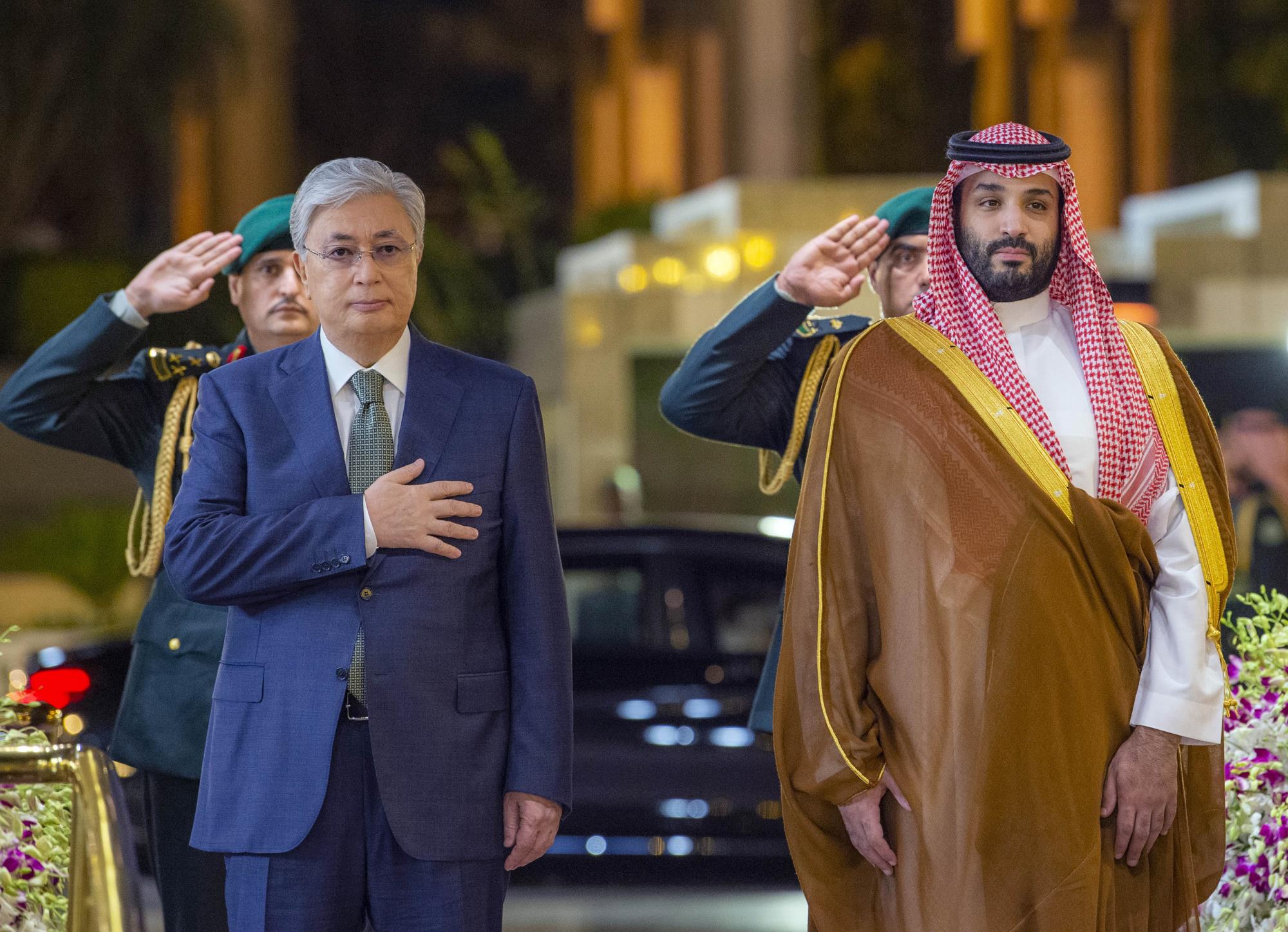 Начальник почётного караула отдал рапорт руководителям двух стран. После исполнения гимнов Казахстана и Саудовской Аравии Касым-Жомарту Токаеву и наследному принцу Мухаммеду бен Салману бен Абдельазизу Аль Сауду представили членов официальных делегаций.