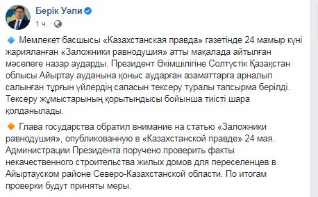 — Глава государства обратил внимание на статью "Заложники равнодушия", опубликованную в "Казахстанской правде" 24 мая. Администрации Президента поручено проверить факты некачественного строительства жилых домов для переселенцев в Айыртауском районе Северо-Казахстанской области. По итогам проверки будут приняты меры, — написал он.