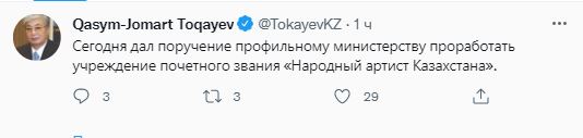 — Сегодня дал поручение профильному министерству проработать учреждение почетного звания «Народный артист Казахстана» , — добавил он.