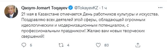 Глава страны отметил, что 21 мая в Казахстане отмечается День работников культуры и искусства, сообащет Caravan.kz