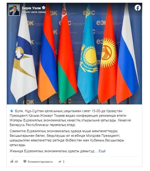 — Заседание состоится под председательством Республики Беларусь в режиме видеоконференции.Планируется, что наряду с главами государств-членов Евразийского экономического союза в саммите примут участие лидеры Молдовы — страны наблюдателя, Узбекистана и Кубы — приглашённых государств. Повестка заседания предусматривает обсуждение актуальных вопросов развития Евразийского экономического союза, в том числе доработанного проекта Стратегических направлений развития евразийской экономической интеграции до 2025 года, некоторых аспектов международной деятельности Союза, — написал в Facebook Берик Уали.