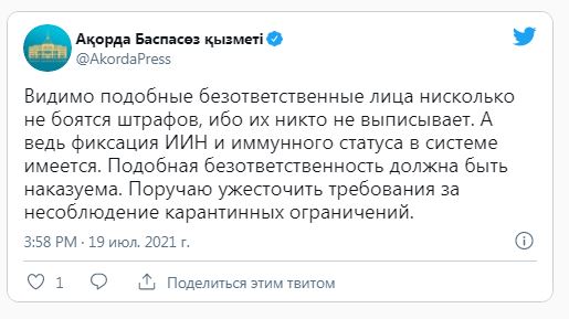 — Вместе с тем за последнее время растет число зараженных и контактных, то есть лиц с «красным» и «желтым» статусами, посещающих общественные места. При этом, как только программа их регистрирует, недобросовестные граждане разбегаются в поисках другого места досуга. Видимо, подобные безответственные лица нисколько не боятся штрафов, ибо их никто не выписывает. А ведь фиксация ИИН и иммунного статуса в системе имеется. Подобная безответственность должна быть наказуема. Поручаю ужесточить требования за несоблюдение карантинных ограничений, — отметил он.