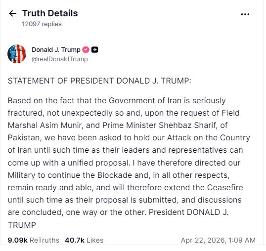 «Ввиду серьезного раскола в иранском правительстве, что, впрочем, ожидаемо, а также по просьбе фельдмаршала Асима Мунира (командующего вооруженными силами Пакистана. — прим.) и премьер-министра Пакистана Шахбаза Шарифа нас попросили приостановить нападение на Иран до тех пор, пока их лидеры и представители не выработают единое предложение», — написал глава Белого дома.