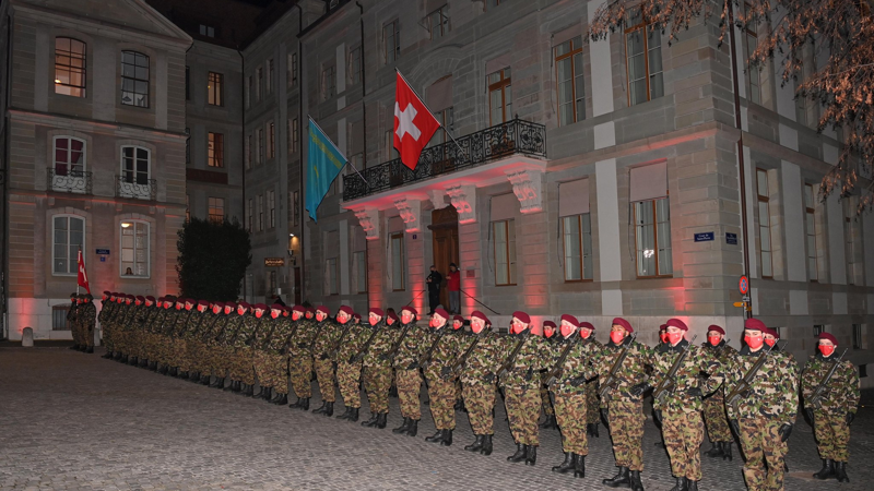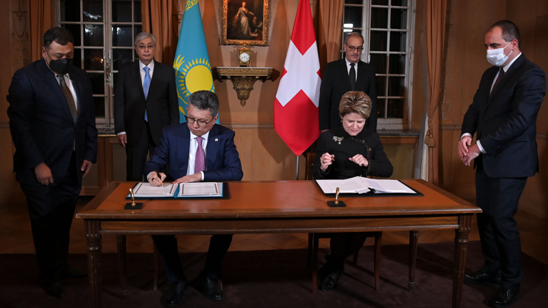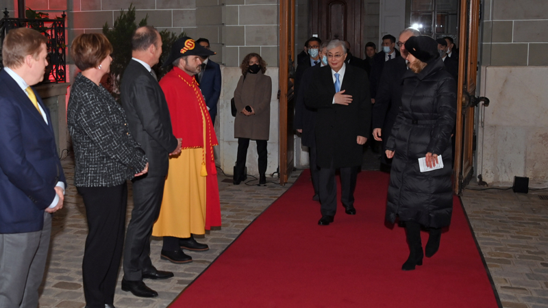 После взаимных приветствий Касым-Жомарт Токаев и Ги Пармелан представили друг другу членов официальных делегаций. Затем прозвучали государственные гимны двух стран. Президенты поклоном поприветствовали флаг Швейцарии и обошли строй почетного караула. По завершении церемонии главы государств провели встречу в узком и расширенном форматах.