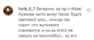 Как отмечают алматинцы, аналогичное «световое шоу» можно наблюдать на пересечении проспекта Абая и улицы Ауэзова, а также в других частях мегаполиса.