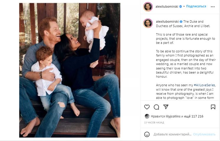 На фотографии герцог и герцогиня Сассекские запечатлены с детьми, сыном Арчи и дочерью Лилибет. До этого Гарри и Меган еще не показывали фотографий Лилибет.