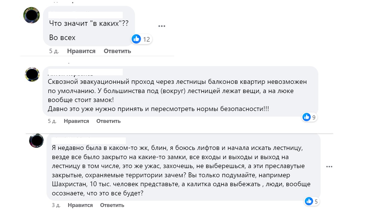 А.К.: «Сквозной эвакуационный проход через лестницы балконов квартир невозможен по умолчанию. У большинства под (вокруг) лестницей лежат вещи, а на люке вообще стоит замок! Давно это нужно принять и пересмотреть нормы безопасности!»