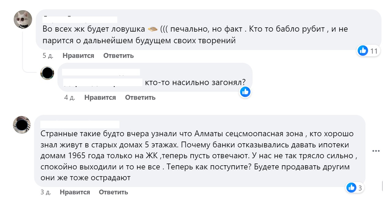 Р. А.: «Странные такие, будто вчера узнали, что Алматы сейсмоопасная зона. Кто хорошо знал, живут в старых домах до 5 этажа. Почему банки отказывались давать ипотеки домам 1965 года, только на ЖК? Теперь пусть отвечают. У нас не так трясло сильно, спокойно выходили, и то не все. Теперь как поступите? Будете продавать другим, они же тоже пострадают".