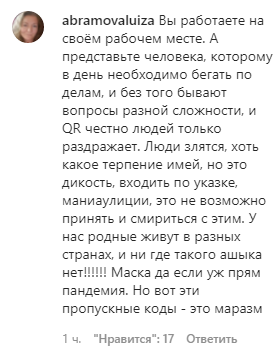 В посте высказался о накипевшем работник сферы продаж: "Работаю продавцом, руководство требует, чтобы клиент проходил через QR-код. От нас это не зависит, но зато нас могут оштрафовать. Просим клиентов, есть, конечно, адекватные, а есть и такие, кто кидается агрессивно. Мы сами устали, как попугаи, повторять одно и то же, нам это тоже не приносит удовольствия".