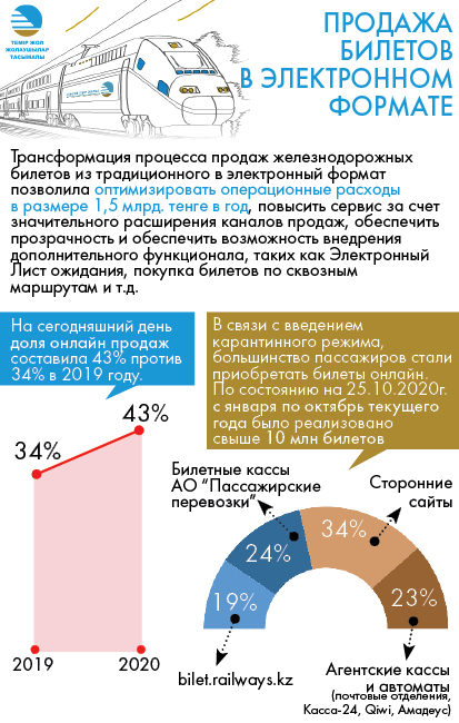 Введение режима ЧП из-за пандемии коронавируса и последующее ужесточение карантинных мер привело к тому, что многие компании стали активнее работать на рынке онлайн. Трансформация процесса продаж железнодорожных билетов из традиционного в электронный формат позволила оптимизировать операционные расходы в размере 1,5 млрд. тенге в год, повысить сервис за счет значительного расширения каналов продаж, обеспечить прозрачность и обеспечить возможность внедрения дополнительного функционала, таких как Электронный Лист ожидания, покупка билетов по сквозным маршрутам и т.д.