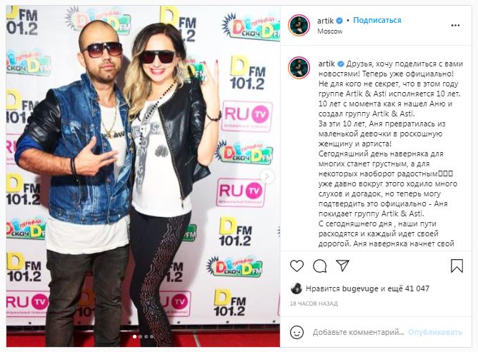 Как написал Artik в своем Instagram, в течение этого периода Анна выросла из маленькой девочки в роскошную женщину и артиста. По его словам, она, скорее всего, начнет свой сольный путь, а он продолжит дело, которым занимается.