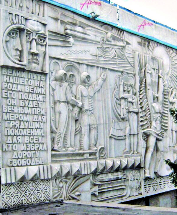 На противоположной стороне – монументальный комплекс бывшего здания политпросвещения. Сейчас в нем находятся офисы различных организаций. Одно из зданий комплекса недавно было полностью перестроено. Увы, все крупные реконструкции в нашем городе приводят к утратам. Так, бывший “Политпросвет” лишился любимых алматинцами фонтанов “Одуванчики” и островка с роскошными ивами. Их заменила каменная площадь с модными, но бесполезными в нашем жарком климате “сухими” фонтанами.