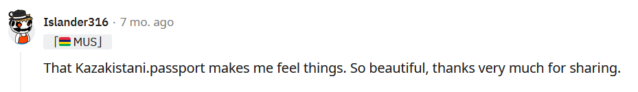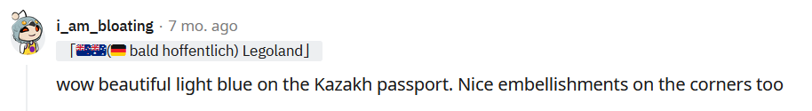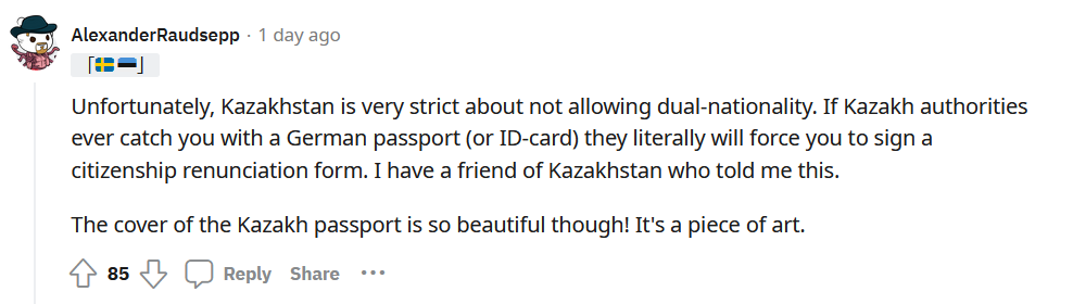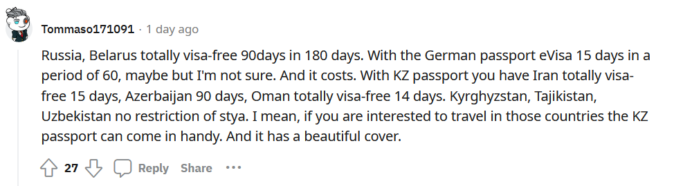 "Россия, Беларусь открыты для безвизового пребывания в течение 90 дней из 180. С немецким паспортом виза позволяет находиться в этих странах 15 дней из 60, но я не уверен. И за нее надо платить. С паспортом Казахстана можно приехать без визы в Иран на 15 дней, в Азербайджан — на 90, Оман — 14 дней, Кыргызстан, Таджикистан, Узбекистан — без ограничений по времени пребывания. Хочу сказать, что если ты заинтересован в путешествиях по этим странам, паспорт Казахстана может пригодиться. И у него прекрасная обложка", — написал один из комментаторов.