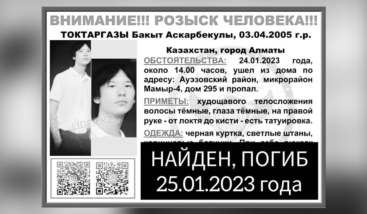 Пропавший без вести в Алматы 17-летний Токтаргазы Бакыт найден мертвым.