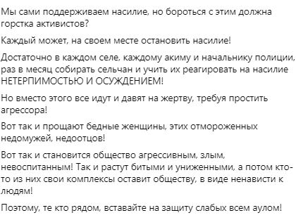 "Но вместо этого все идут и давят на жертву, требуя простить агрессора. Вот так и прощают бедные женщины этих отмороженных недомужей, недоотцов! Вот так и становится общество агрессивным, злым, невоспитанным! Так и растут битыми и униженными, а потом кто-то из них свои комплексы оставит обществу в виде ненависти к людям. Поэтому те, кто рядом, вставайте на защиту слабых всем аулом ", — призвала лидер движения "Немолчи.kz".