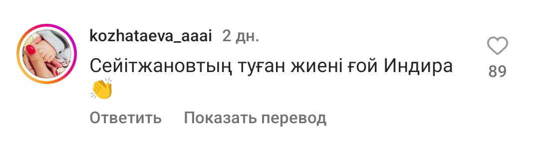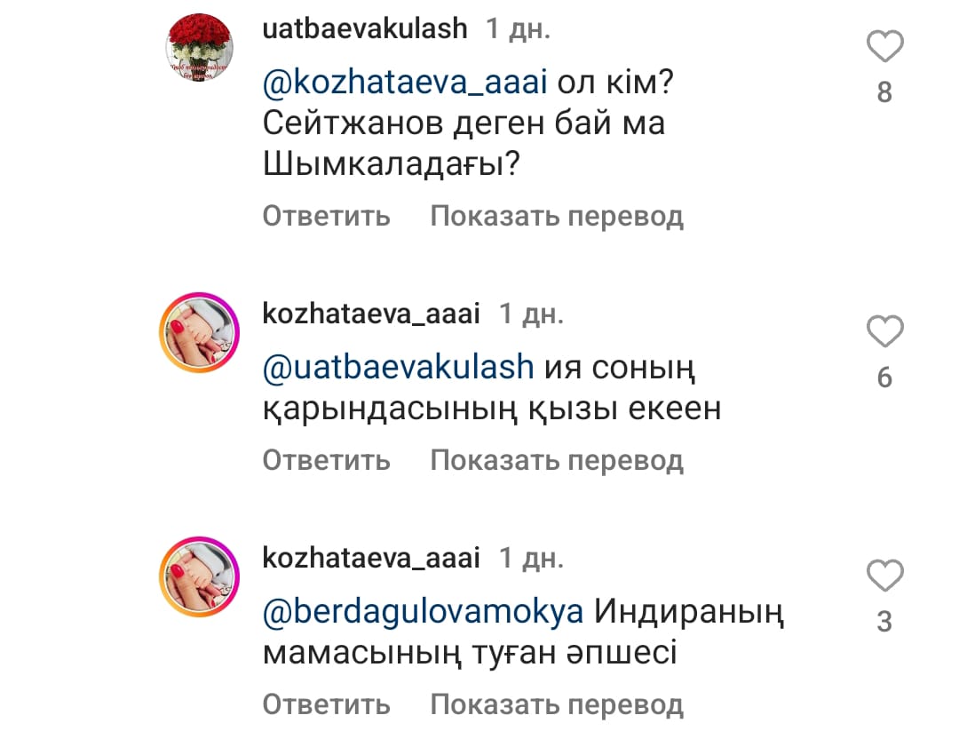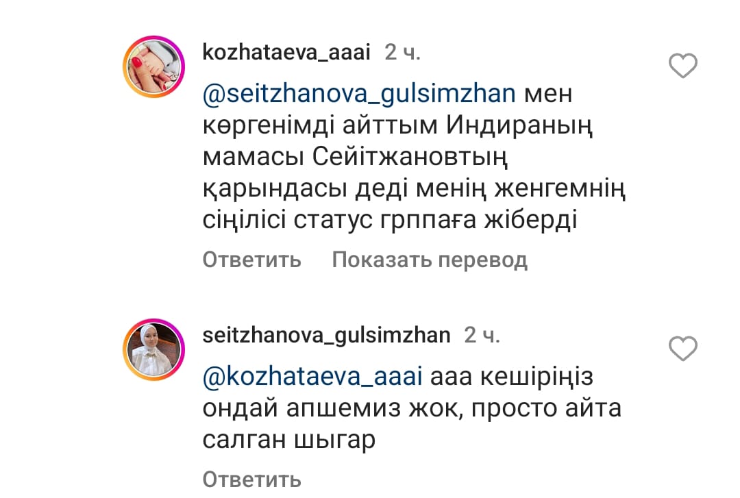 В комментариях к ролику жительница Шымкента, сноха которой, по ее словам, была на свадьбе, рассказала деталь из биографии Индиры, о которой она сама не упоминала в социальных сетях.