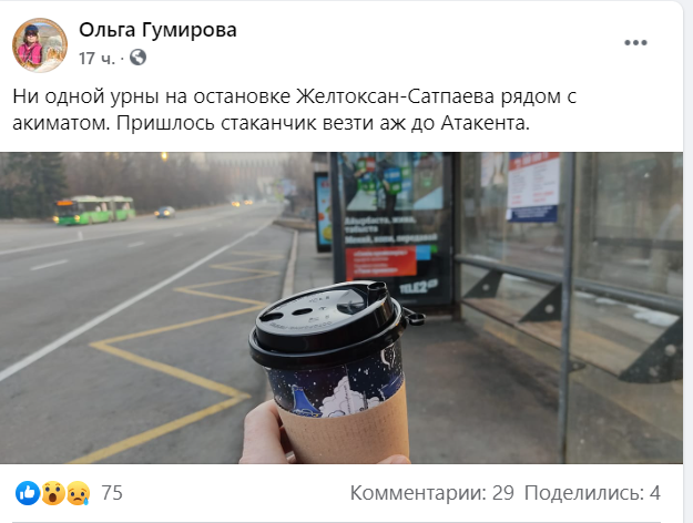 "Ни одной урны на остановке Желтоксан — Сатпаева рядом с акиматом. Пришлось стаканчик везти аж до Атакента", — пожаловалась участница группы и активистка Ольга Гумирова.