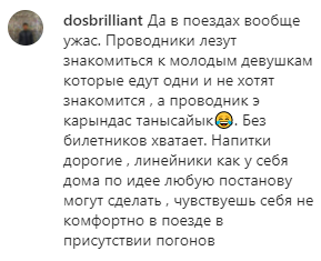"Услуги за эти деньги: полный вагон пьяных безбилетников, мат от них, и еще сидят с полицейскими в одном вагоне, проводники пьяные вместе с ними. Это кошмар, а в инвалидном туалете всё забито передачами, поэтому и не открывают его. Это кошмар," — написала казахстанка и выложила видео, на котором общается с полицейскими и показывает коробки в туалете для инвалидов: