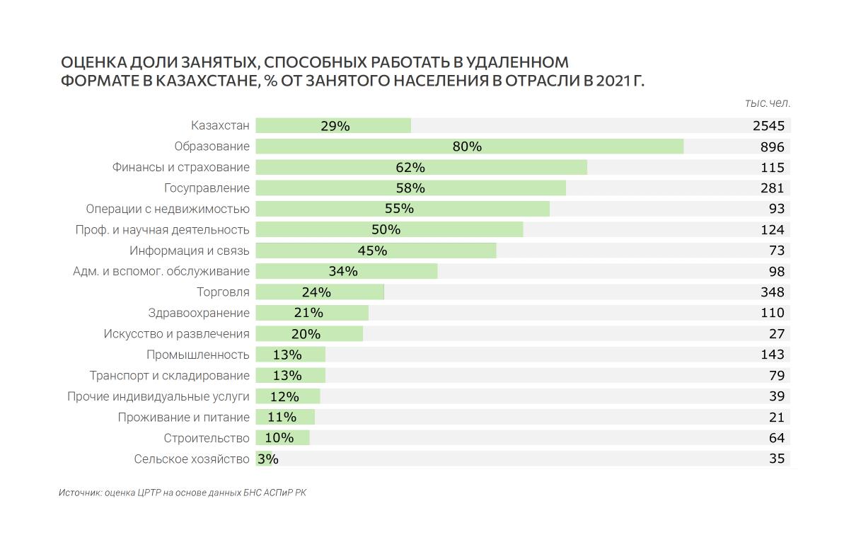 В Казахстане удаленка пока не так популярна. На досках объявлений число вакансий, предполагающих дистанционный график работы, не превышает 2 %. Однако потенциал к переходу более значительной доли рынка труда на дистант достаточно внушительный. Так, ЦРТР (Центр развития трудовых ресурсов) оценивает долю занятых, способных потенциально работать в удаленном формате, уже сейчас в 29 % от числа общей рабочей силы.