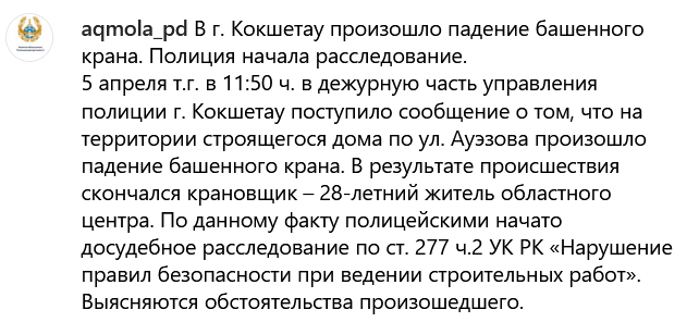 "5 апреля т.г. в 11:50 в дежурную часть управления полиции г. Кокшетау поступило сообщение о том, что на территории строящегося дома по ул. Ауэзова произошло падение башенного крана. В результате происшествия скончался крановщик – 28-летний житель областного центра. По данному факту полицейскими начато досудебное расследование по ст. 277 ч.2 УК РК «Нарушение правил безопасности при ведении строительных работ». Выясняются обстоятельства произошедшего", — сообщили в Департаменте полиции Акмолинской области.