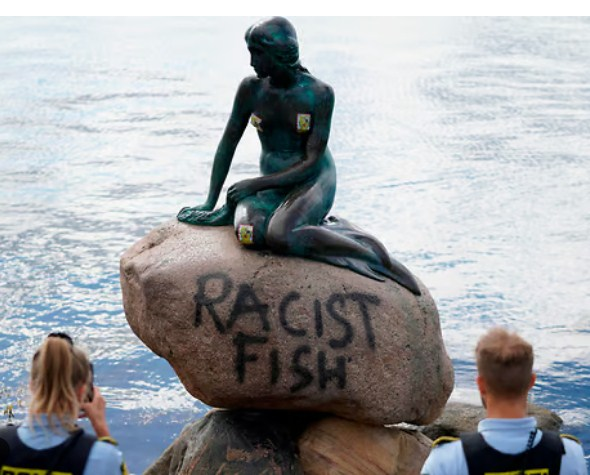"Русалочке" в Копенгагена от "снежинок" доставалось дважды. Сначала статую осквернили потому что она якобы обнаженной грудью проповедовала сексизм, а второй раз памятник по непонятной логике обозвали расисткой рыбой.