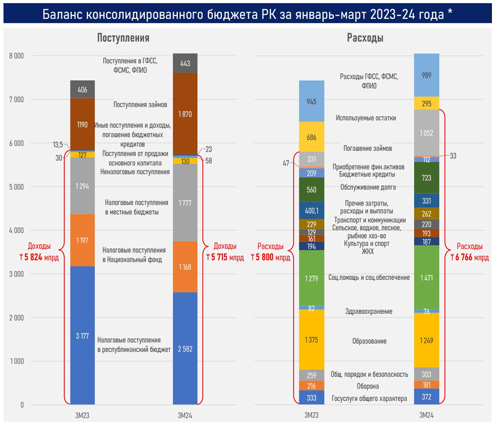 А вот расходы всего бюджета выросли на 17 %, или 966 млрд — до 6,8 трлн тенге. Это превышает доходную часть на 18 %, или 1,1 трлн тенге.