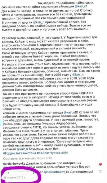 А на днях мама и продюсер Кайрата Нуртаса Гульзира Айдарбекова официально дала понять всем, что они в разводе, плюс две недели назад до вылета на Мальдив появились видео Кайрата Нуртаса, как он заплакал в машине, написав о том, что прилагал все усилия, чтобы день рождения провести со своими детьми на Мальдивах, но не не сложилось! Помню, когда прогноз я опубликовал на странице, Жулдыз заходила в мой профиль и посмотрела мои сторис. А в прошлом году приближенные к семье Нуртас стали получать у меня консультации, но про него не обсуждали. Видимо, они поняли что мой прогноз сбылся и убедились в моей работе, но сказать не смогли (скорее, не хотели, чтобы распространялось где-то)", — написал мужчина.