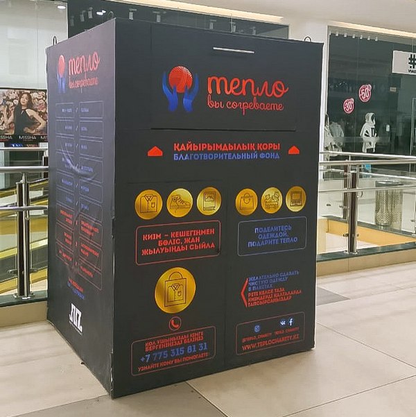 Сейчас по городу расположены 6 мобильных боксов в единой стилистике – они есть в крупных торговых центрах Алматы, в самое ближайшее время будут установлены дополнительные пункты по приему вещей.
