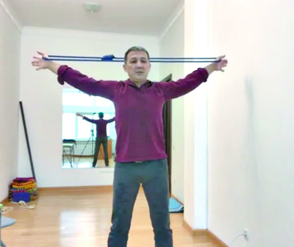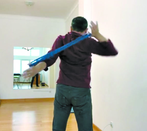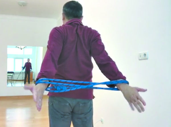 Как вариант, можно надеть двойное кольцо веревки на запястья восьмеркой, то есть перекрестно, чтобы ладони были вывернуты наружу, плечи развернуты. И еще с силой потянуться, сохраняя осанку.
