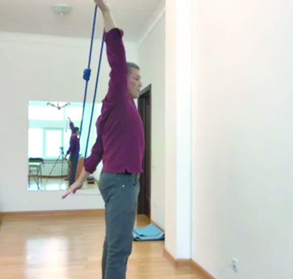 Затем в том же натянутом состоянии опускаем веревку за лопатки и растягиваем связки и мышцы середины груди, передние дельтовидные мышцы и связочно-сухожильный аппарат запястьев. Потом поднимаем веревку выше и тянем поджилки, сухожилия и связки плеч.