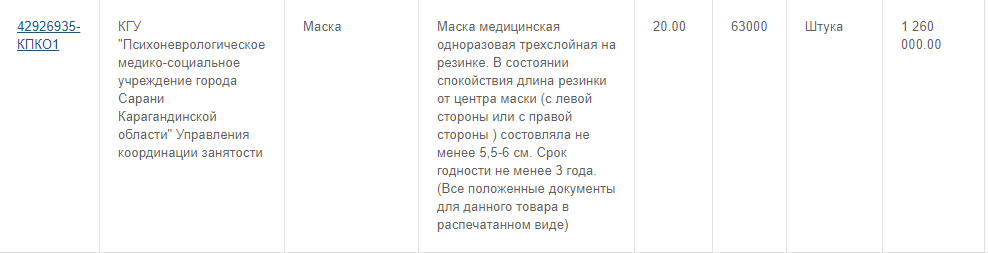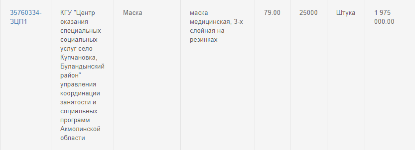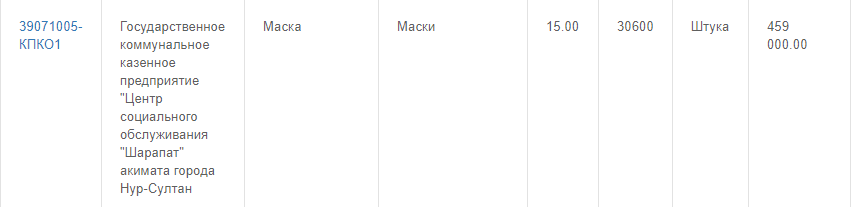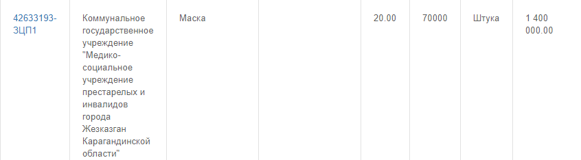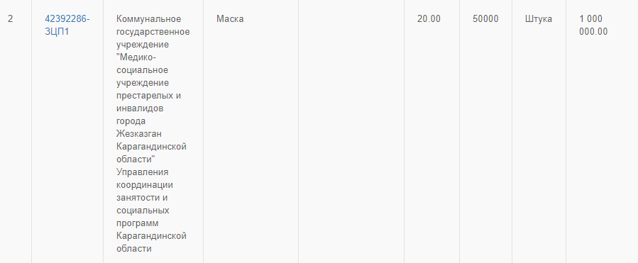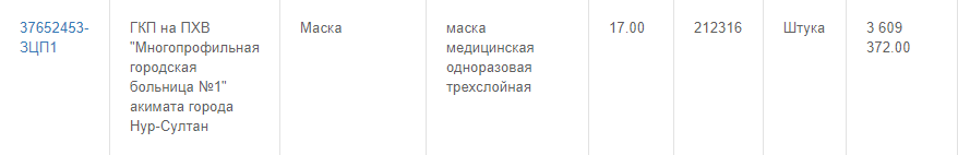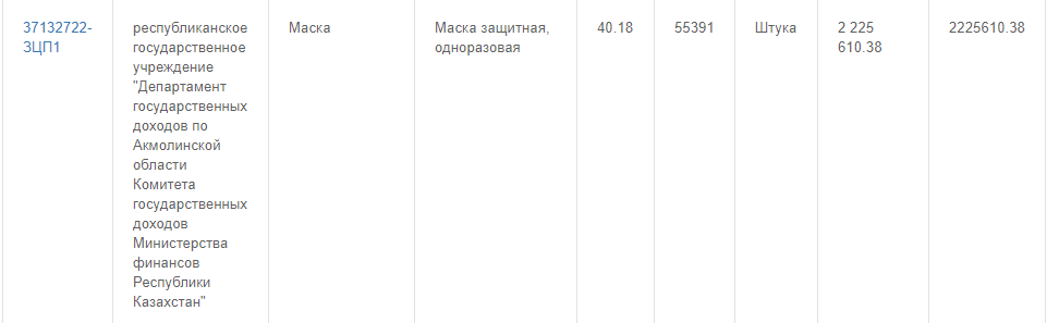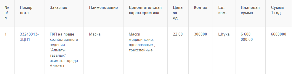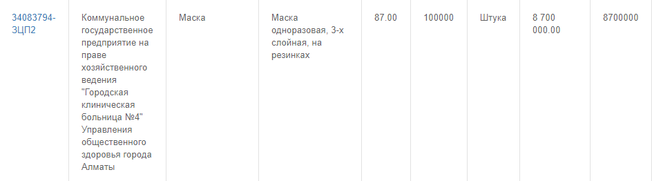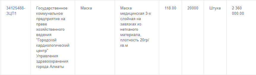 В Алматы ситуация с закупками одноразовых медицинских масок выглядит весьма интересно. Так, например, государственное коммунальное предприятие "Алматы тазалык" закупило крупную партию из 300 тысяч масок за 6 миллионов 600 тысяч тенге, то есть по 22 тенге за штуку.