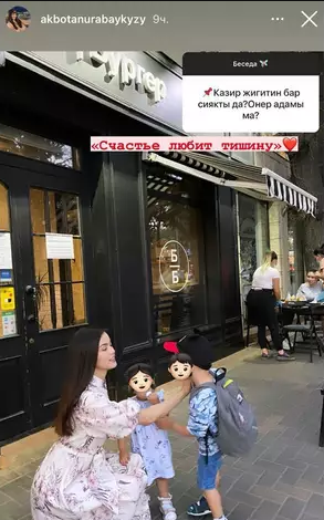 Напомним, в прошлом году Акбота развелась с Дауреном Айдаркуловым, от которого у неё двое детей. Артистку часто спрашивают о том, нет ли у неё нового возлюбленного, но она не отвечает ничего конкретного, хотя в прошлом году в Казнете обсуждали фотографию, на которой она в объятиях неизвестного широкой общественности мужчины.