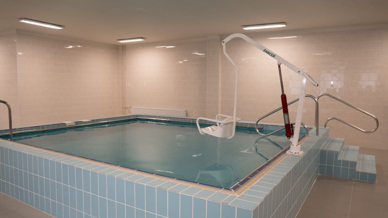 В отделении термогидротерапии предусмотрены помещение лечебных бассейнов с двумя лечебно-плавательными бассейнами. Имеется спортивный и актовый зал.
