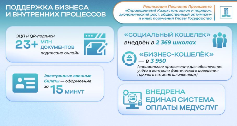 «Мы внедряем цифровые решения в социальной сфере. Проект «Социальный кошелек» позволяет отслеживать предоставление бесплатного питания, исключать приписки и эффективнее расходовать бюджетные средства. Сегодня этот инструмент масштабируется и внедряется во всех школах страны», — добавил Жаслан Мадиев.