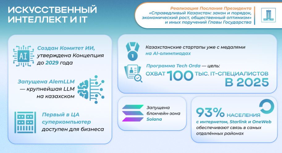Глава государства отметил, что Казахстану необходимо укреплять достигнутые результаты в этой сфере, активно внедрять технологии искусственного интеллекта в платформу «электронного правительства». В связи с этим Правительство усиливает работу по внедрению цифровых решений и технологий ИИ во всех сферах, рассматривая их как ключевой инструмент ускорения экономического роста страны, пишет Caravan.kz со ссылкой на сайт премьер-министра РК.
