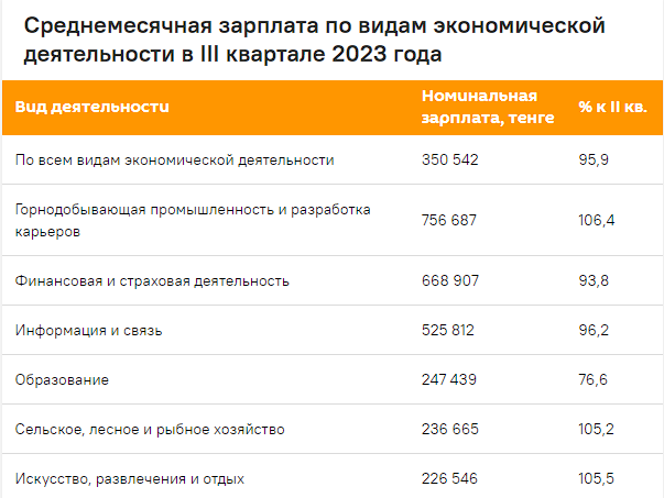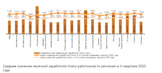 В III квартале 2023 года в региональном разрезе статистики отметили наибольший рост среднемесячной номинальной заработной платы по сравнению с соответствующим кварталом 2022 года в Жетысуской области (21,1%), в Алматы (20,8%) и в Кызылординской области (20,7%).